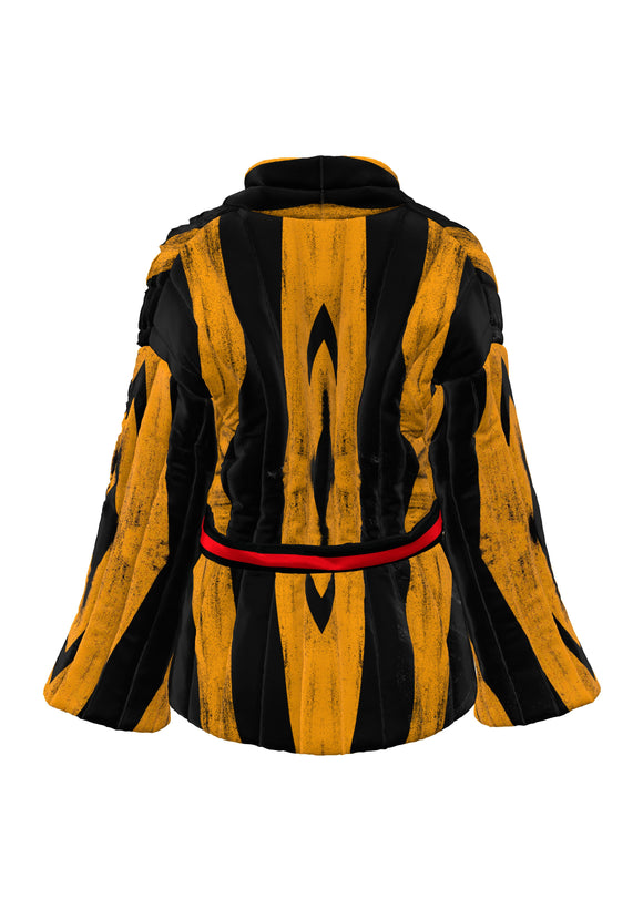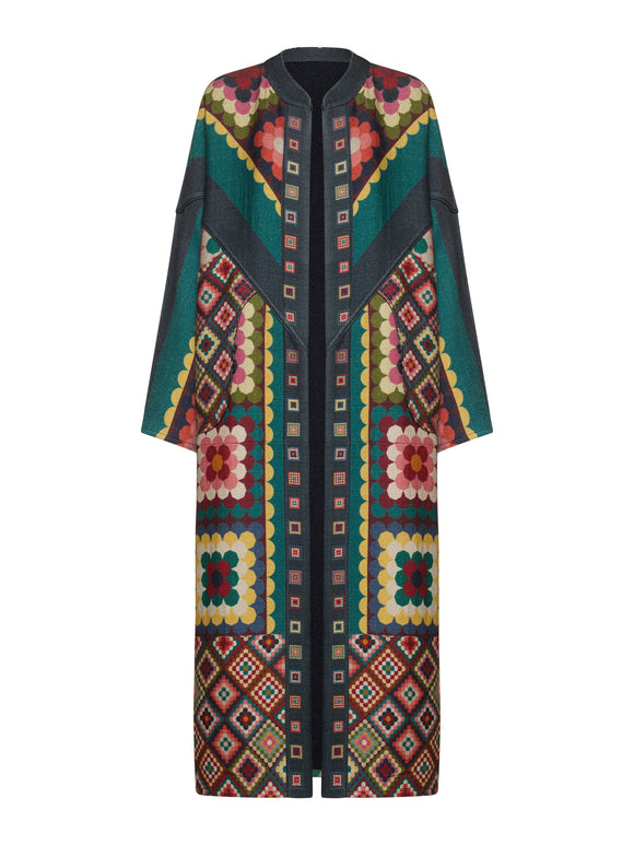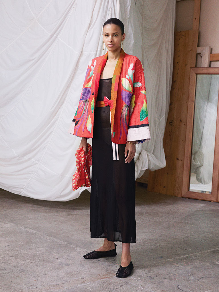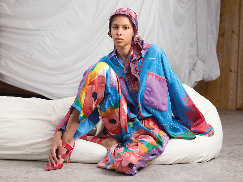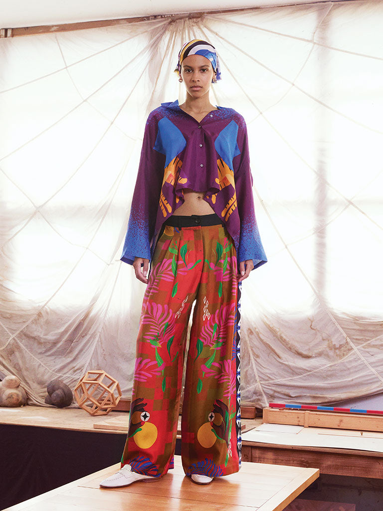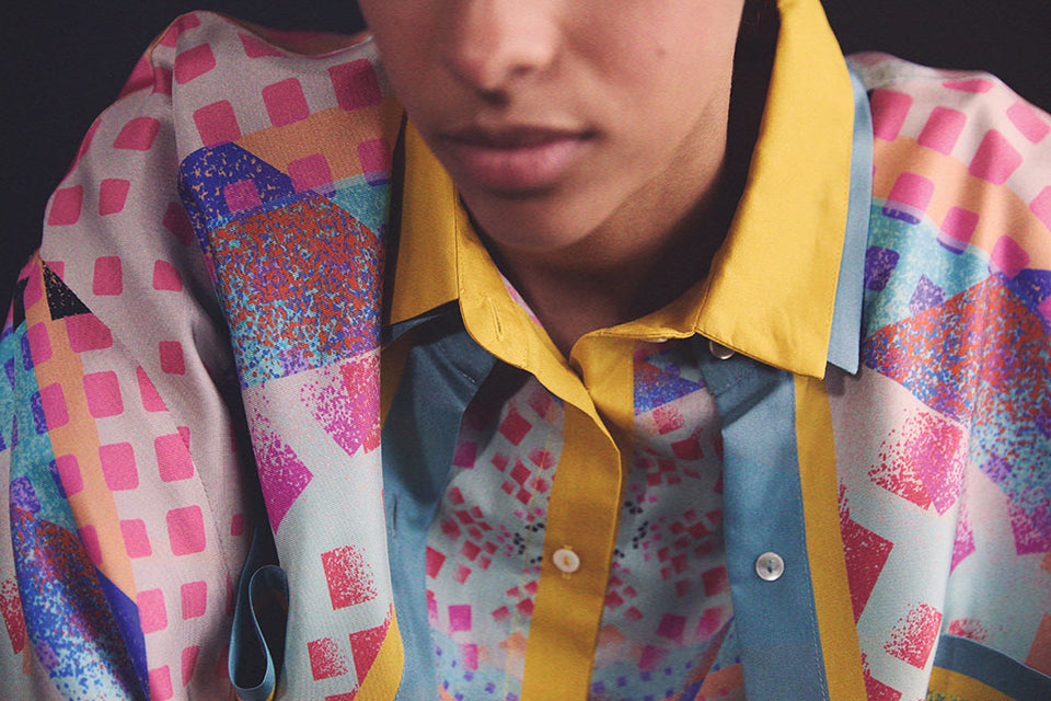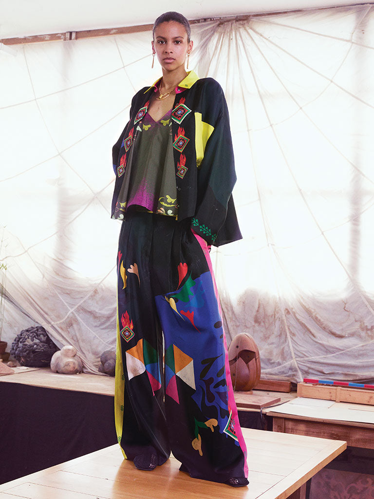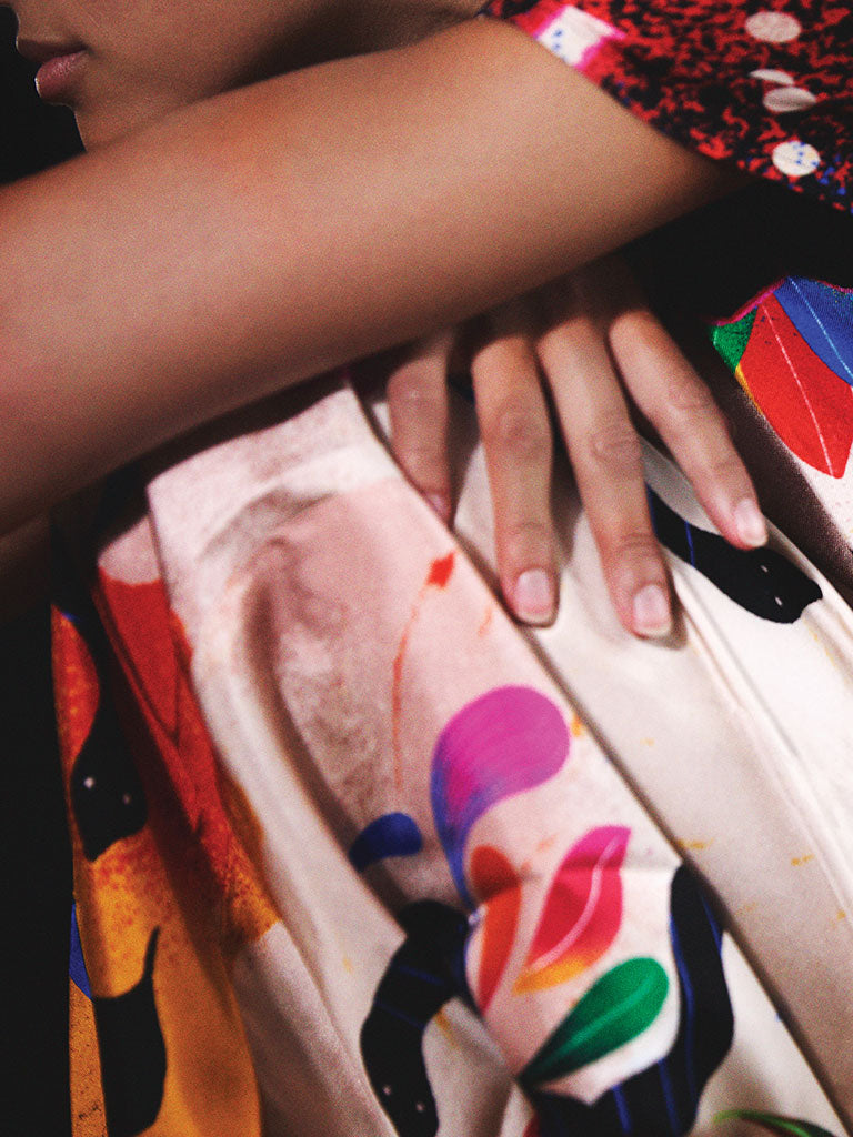 The Carré artworks are magically transformed into shirts, jackets, dresses, skirts, and trousers decorated like pictorial canvases.