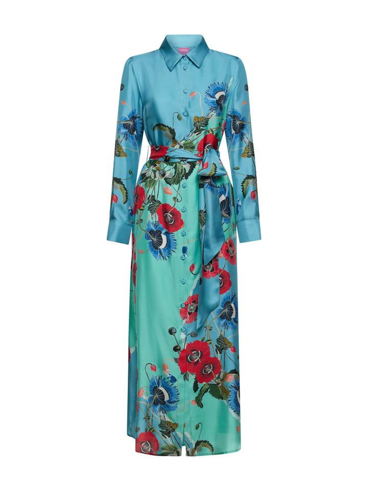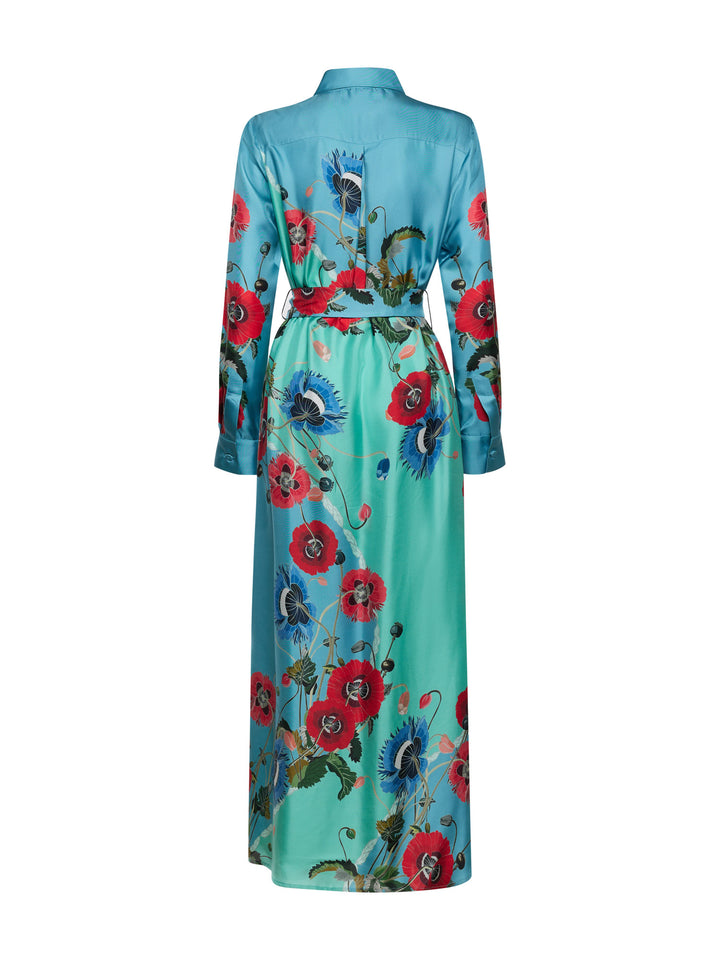Silk longsleeve chemisier dress with belt. Red poppies print.