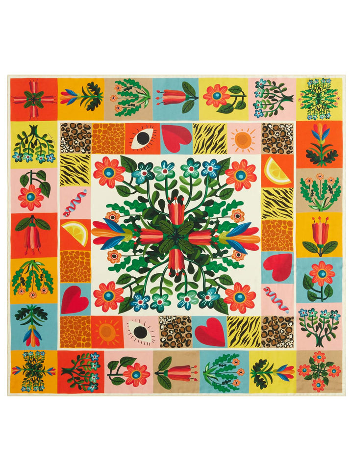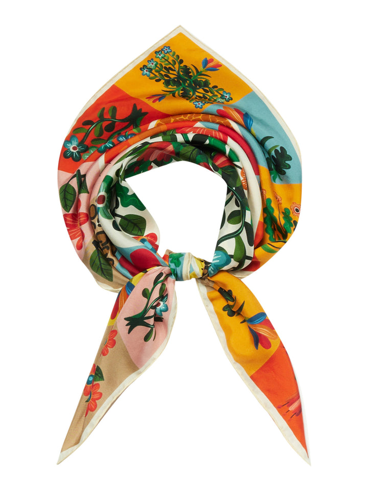 Silk 90x90 carré foulard with handrolled hem. Mexico print.