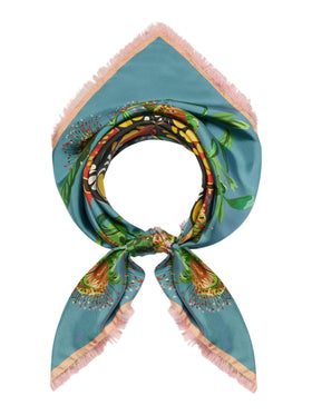 Silk 90x90 carré foulard with fringed hem. Passion flower print.